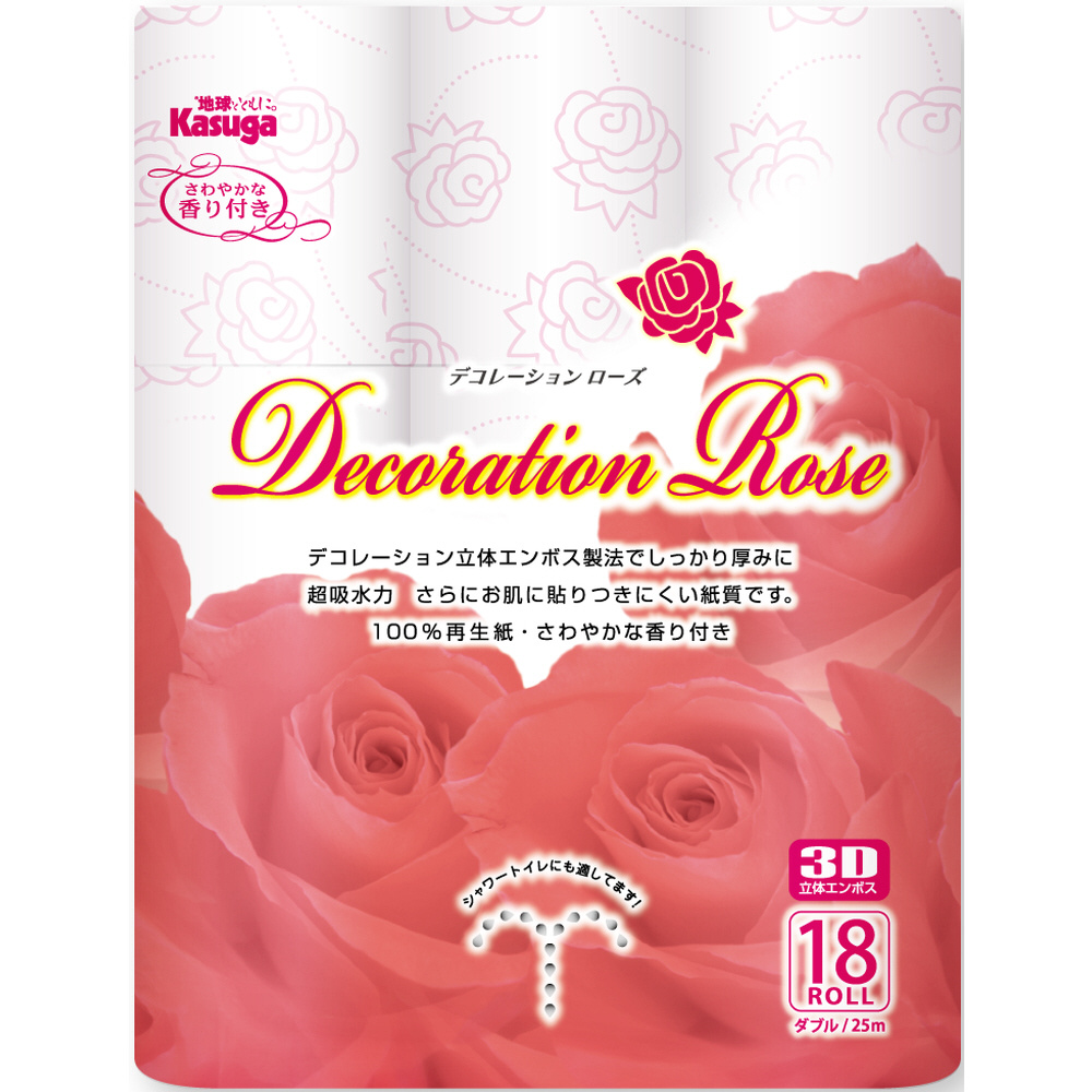古紙100%で地球にやさしいトイレットロール。デコレーション立体エンボスでしっかり厚みの超吸水ロール。シャワートイレにも適した吸水力。さわやかな薔薇の香り付。