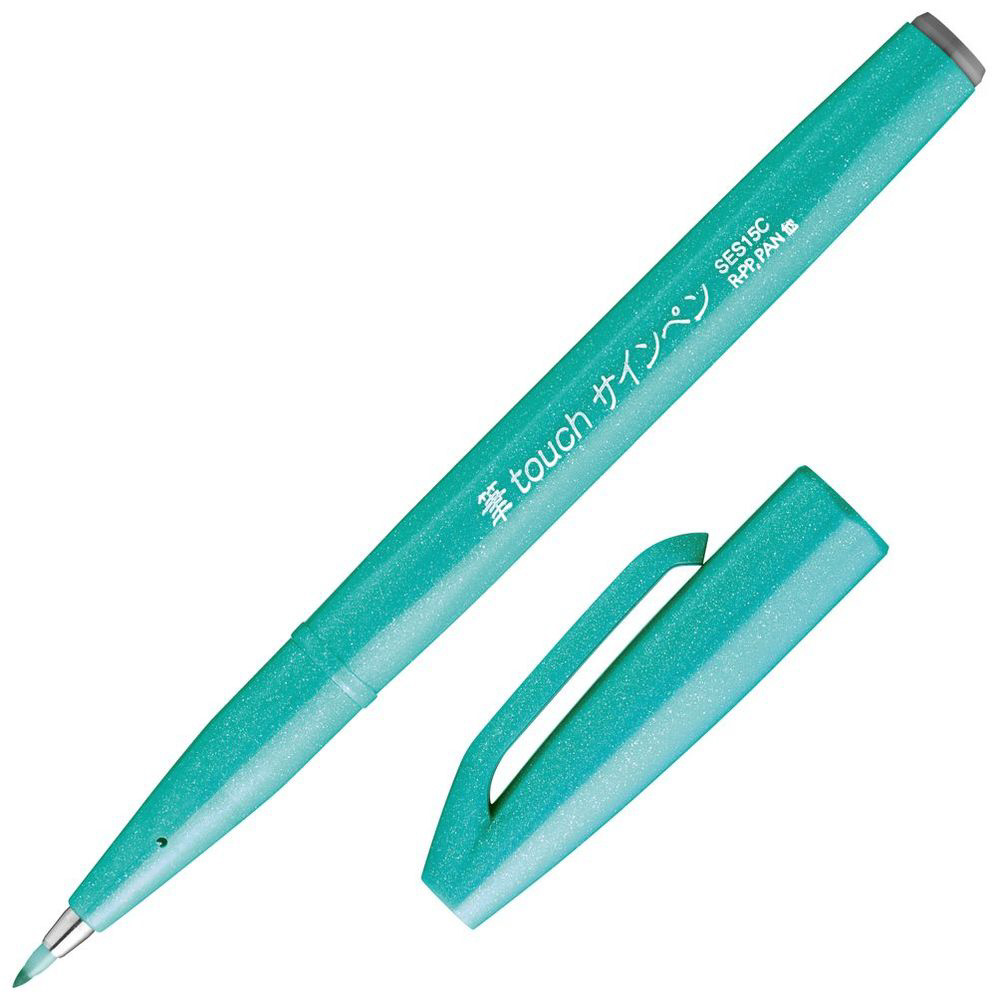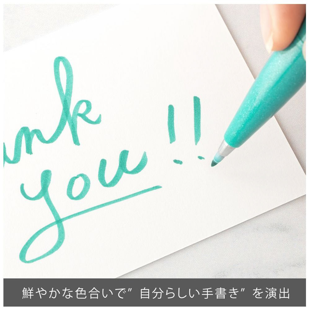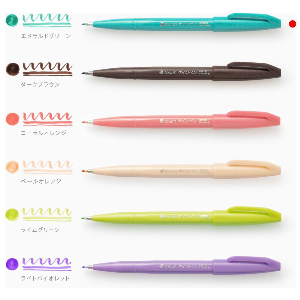 「筆タッチサインペン」には、文字にも装飾にも使いやすい、エメラルドグリーン、ダークブラウン、コーラルオレンジ、