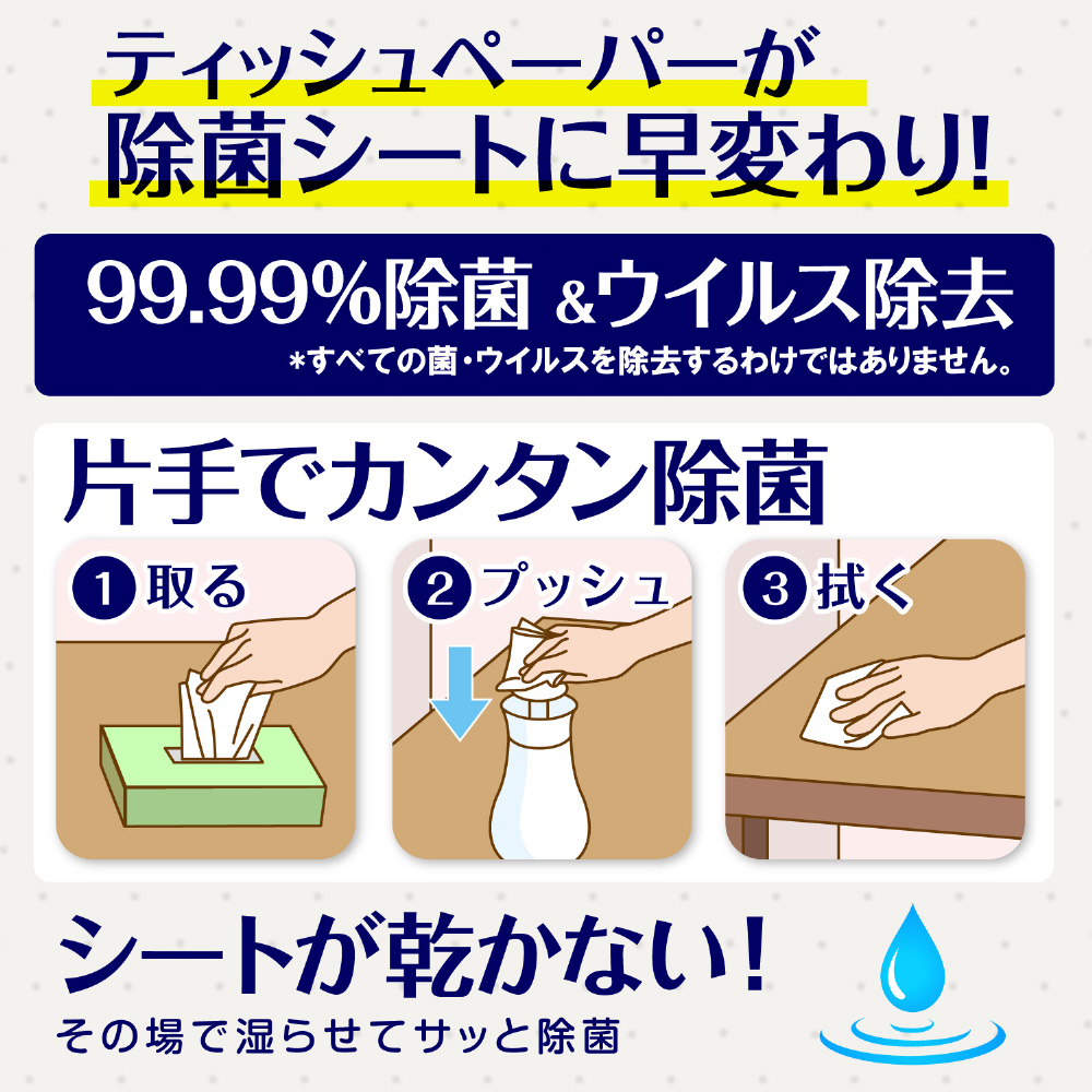 2.キッチンペーパー、ティッシュ、乾いた布などをポンプ上部に押し当てプッシュし(目安: 一回あたり1プッシュ)、除菌したい部分を拭く。その後二度拭きや洗い流しは不要。