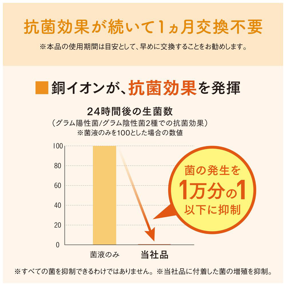 ・抗菌効果が続いて1カ月交換不要。銅イオンが抗菌効果を発揮。