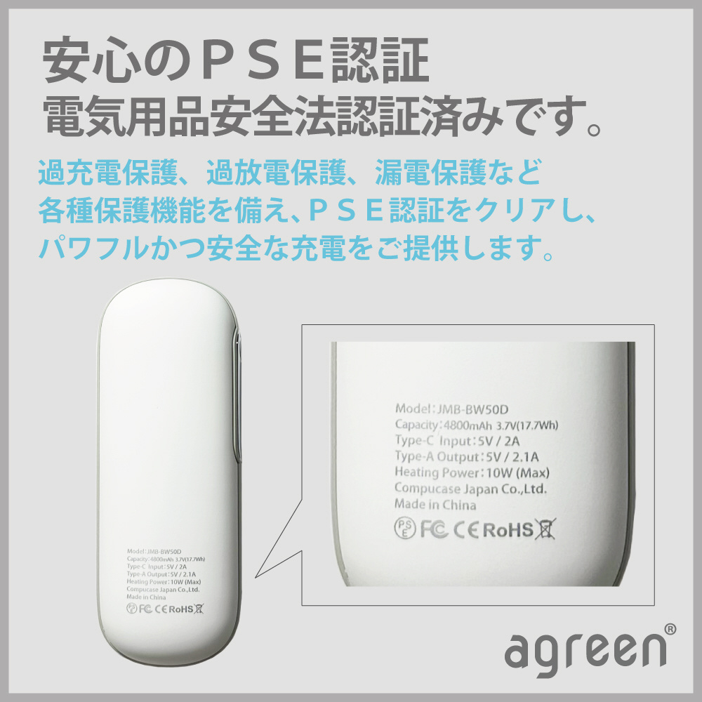 2段階加熱モードあったかモバイルバッテリー。スマートチップ搭載により均等に発熱。モバイルバッテリー機能搭載でスマートフォンに充電できます。