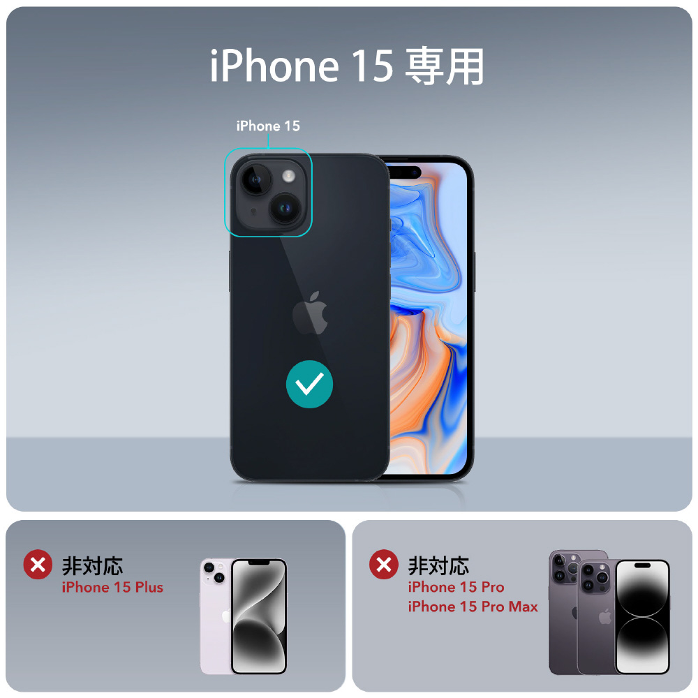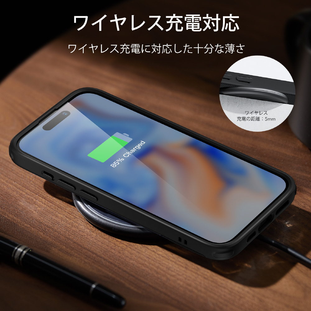 iPhone 15専用。ケース付きのまま充電できる、ワイヤレス充電対応のスリムなケース。