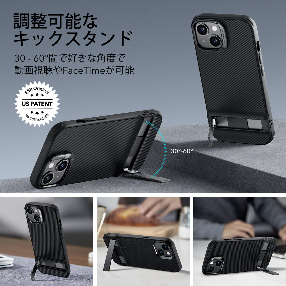 iPhone 15用スタンドケースは、30°から 60°まで自由に角度を選択でき、特許取得済み。耐久性のあるヒンジは、3,000 回以上の使用後も通常使用できることがラボでテストされています。