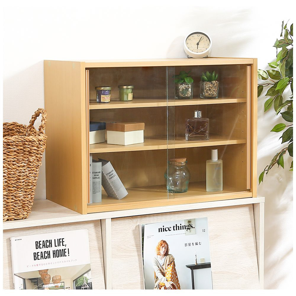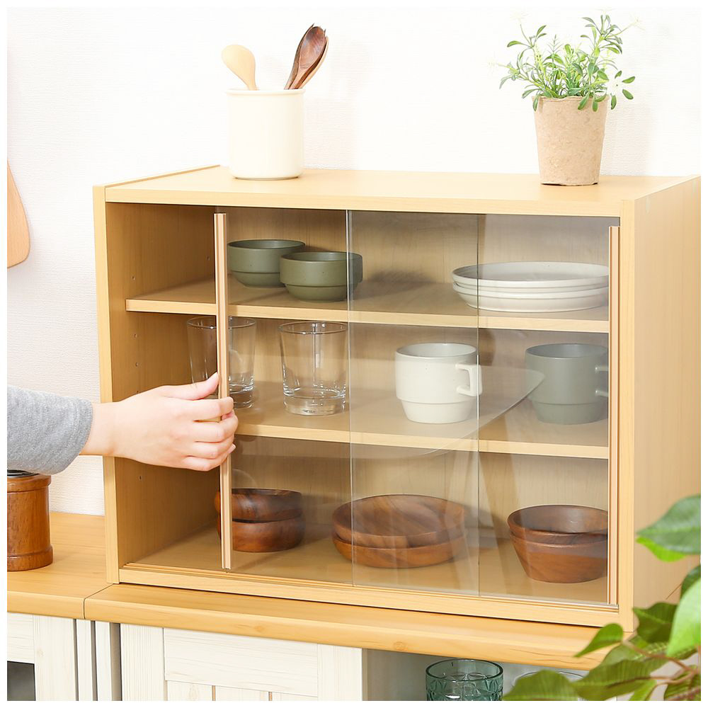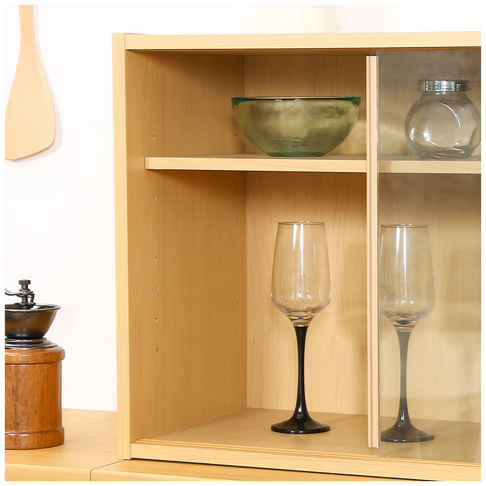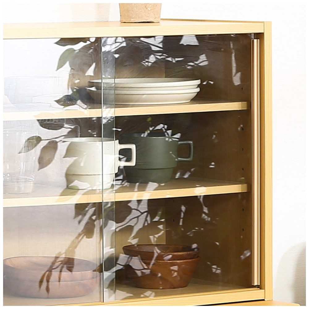 スライド式ガラス扉で収納物が分かりやすく、棚板は8段階調節可能。