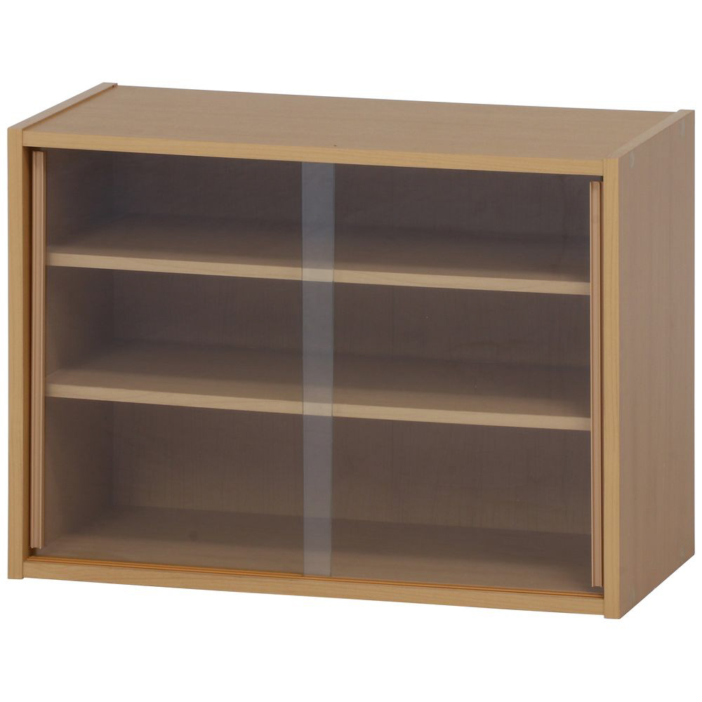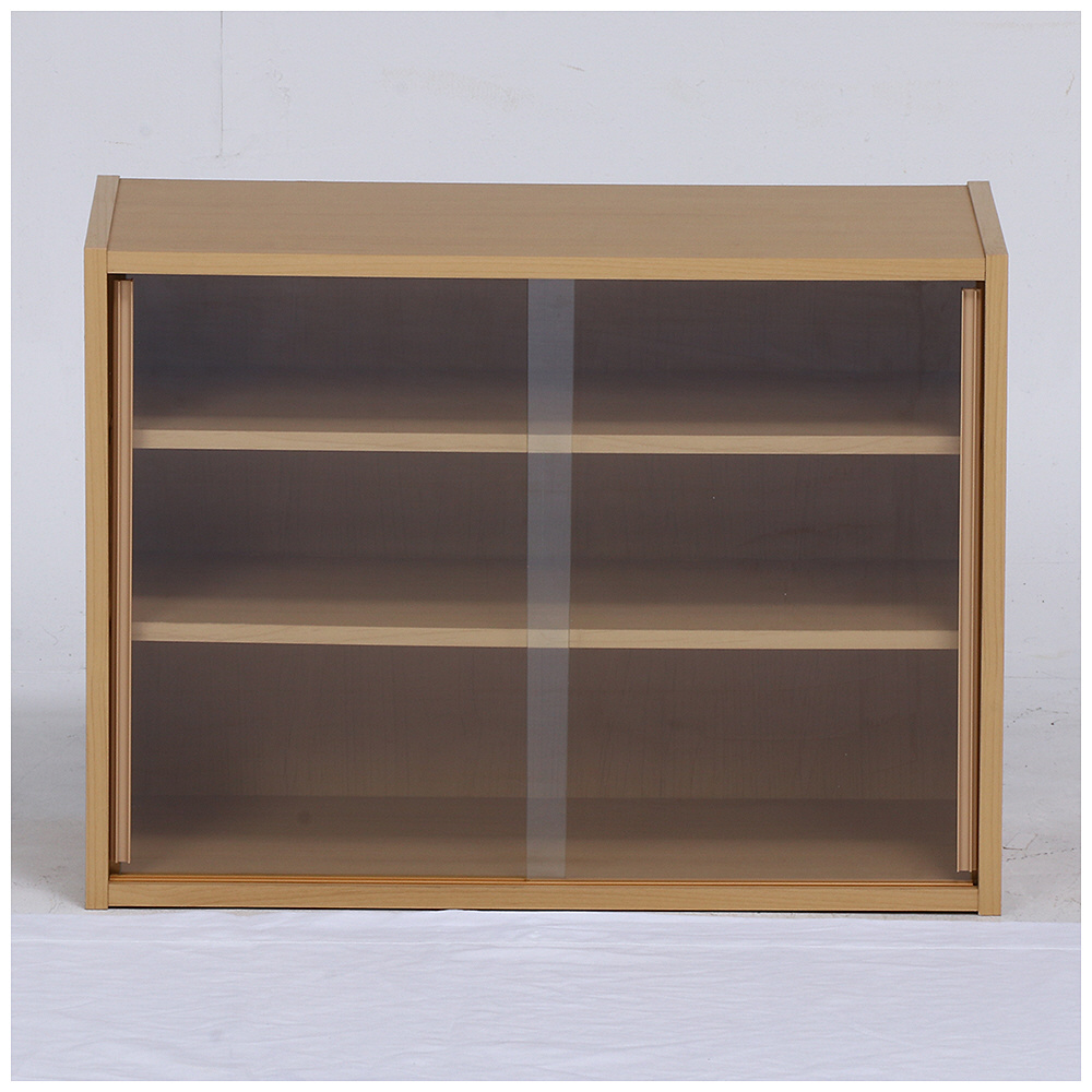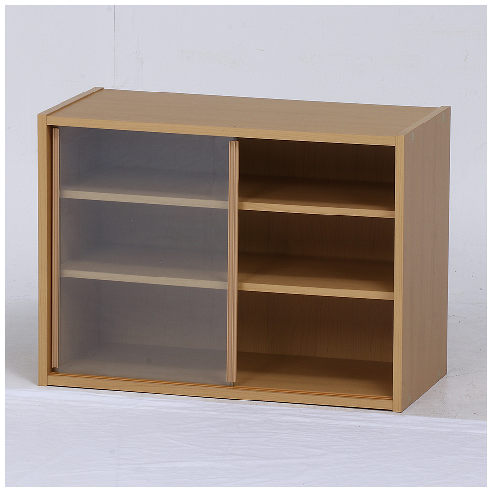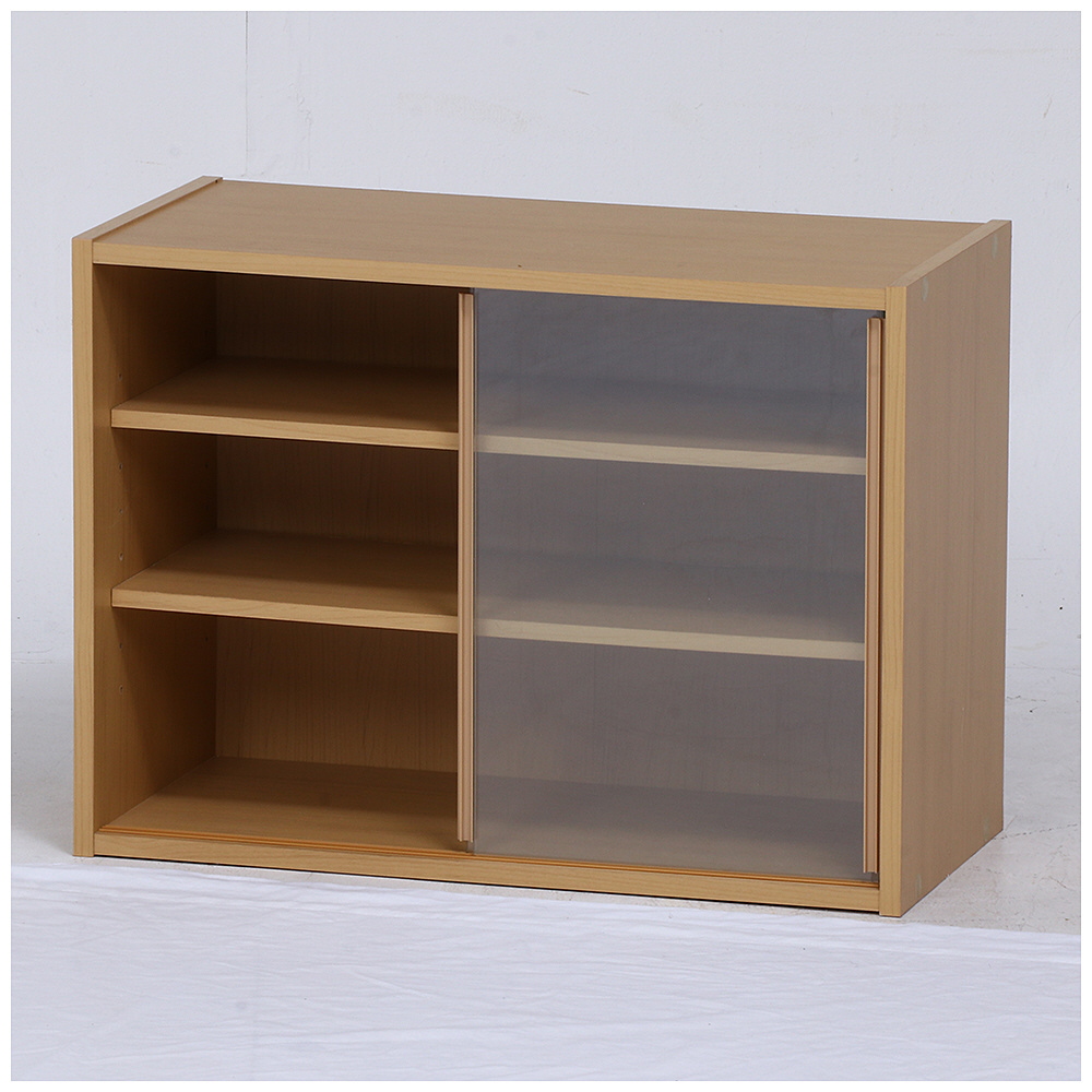 スライド式ガラス扉で収納物が分かりやすく、棚板は8段階調節可能。