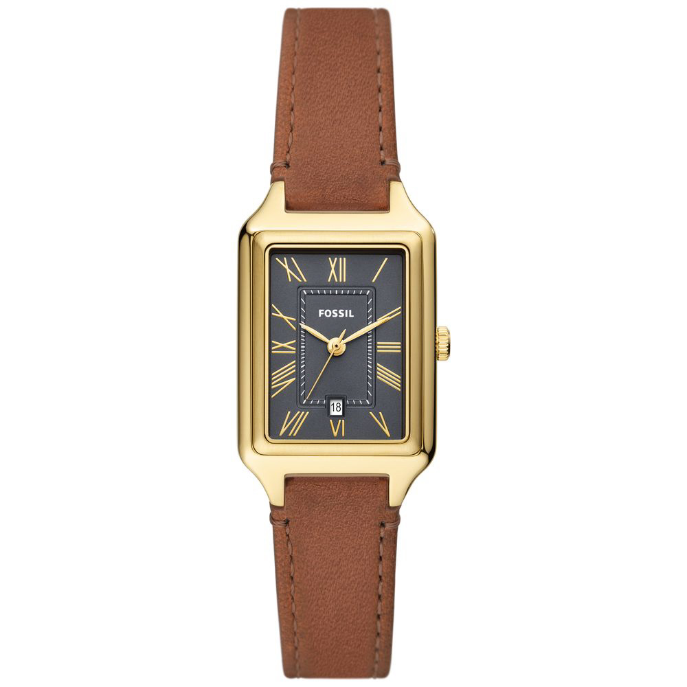 レクタングル型のRAQUELウォッチ。サテン仕上げを施したチャコールグレーのウォッチフェイス、デイト表示付き三針ムーブメント、ブラウンのLiteHide?レザーストラップが魅力的な、スリムでコーディネートしやすいウォッチです。
