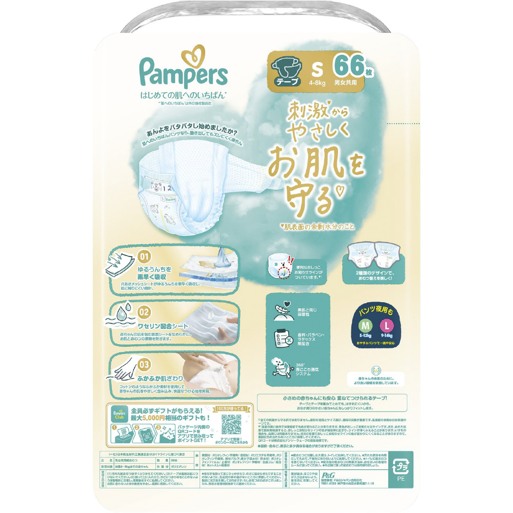 <テープ Sサイズ(4-8kg)> パンパース オムツ はじめての肌へのいちばん 肌一番 肌いち ふかふか 大容量 198枚(66枚×3個)