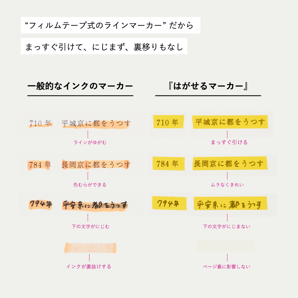 従来のインク式ラインマーカーにありがちなインク汚れや色むら、裏移り、文字のにじみなどが無く、