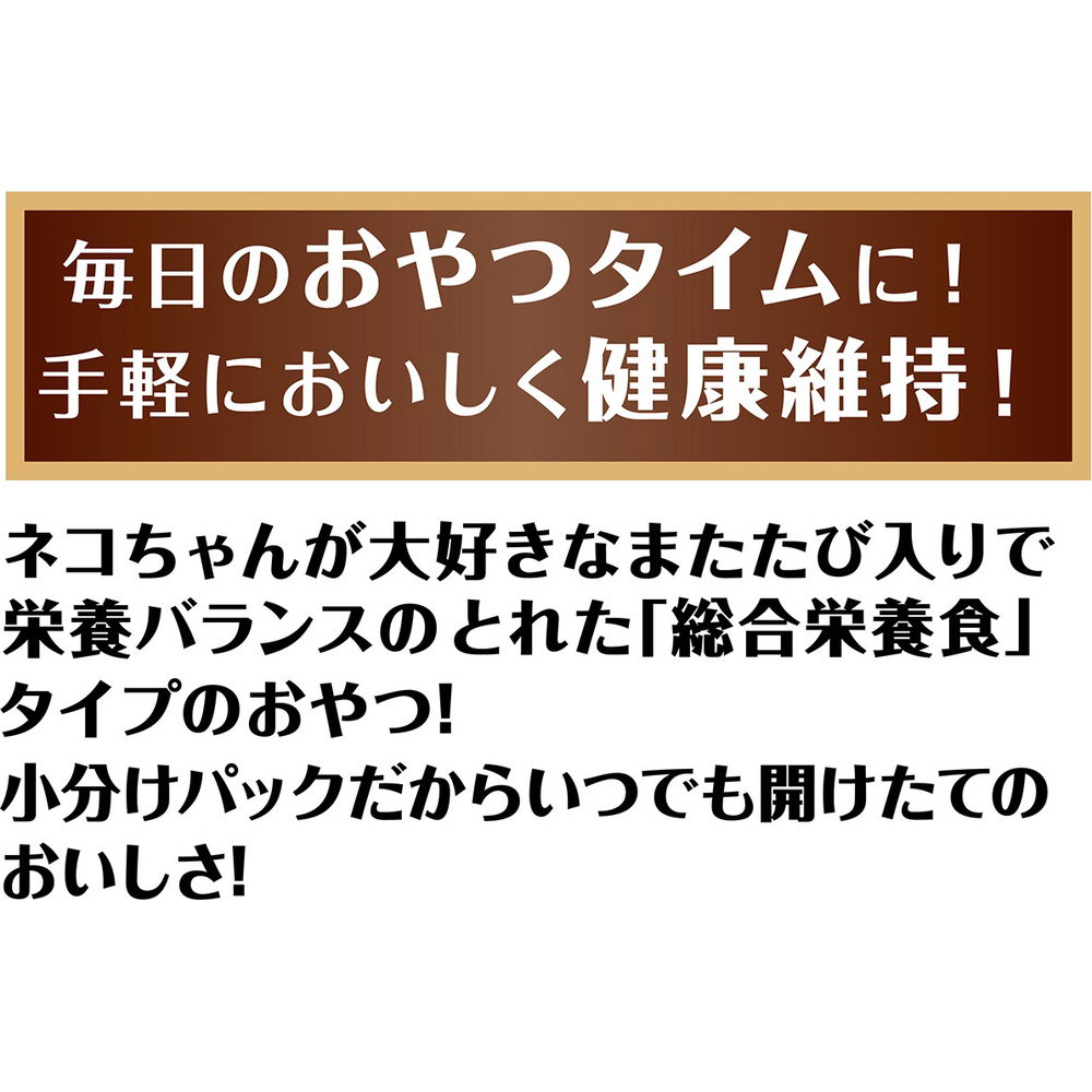 ネコちゃんが大好きなまたたび入りで、栄養バランスのとれた「総合栄養食」タイプのおやつ!小分けパックだからいつでも開けたてのおいしさ!ネコちゃんの大好きなシーフードミックス味。