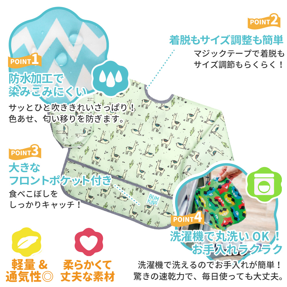 油汚れも落ちる! 大判ビブでお食事をサポート! 手首までしっかりカバーできる袖つきビブ。