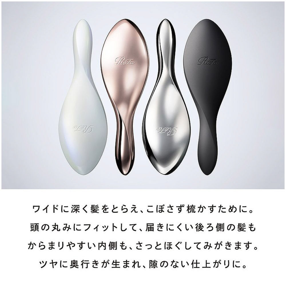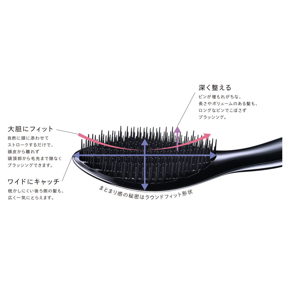 頭の丸みにフィットするラウンドフィット形状とロングなピンで、ブラシを通しづらい後ろ側や内側の髪もしっかりキャッチ。一度に広範囲をブラッシングできるから、面が揃ってツヤもアップ、より隙のない美しいスタイルに導きます。