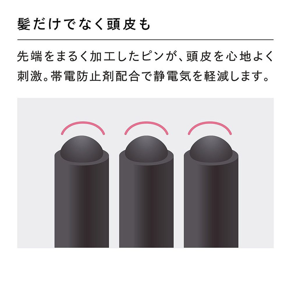先端をまるく加工したピンが、頭皮を心地よく刺激。帯電防止剤配合で静電気を軽減します。