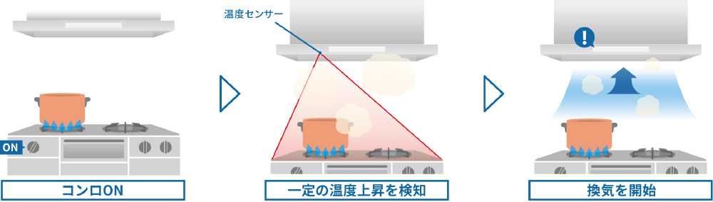 「サーモ ON サポート」は一定の温度上昇を検知して機能します。温度条件によってはレンジフードの運転を開始しない場合もありますので調理の際には換気がおこなわれていることを必ずご確認ください。
