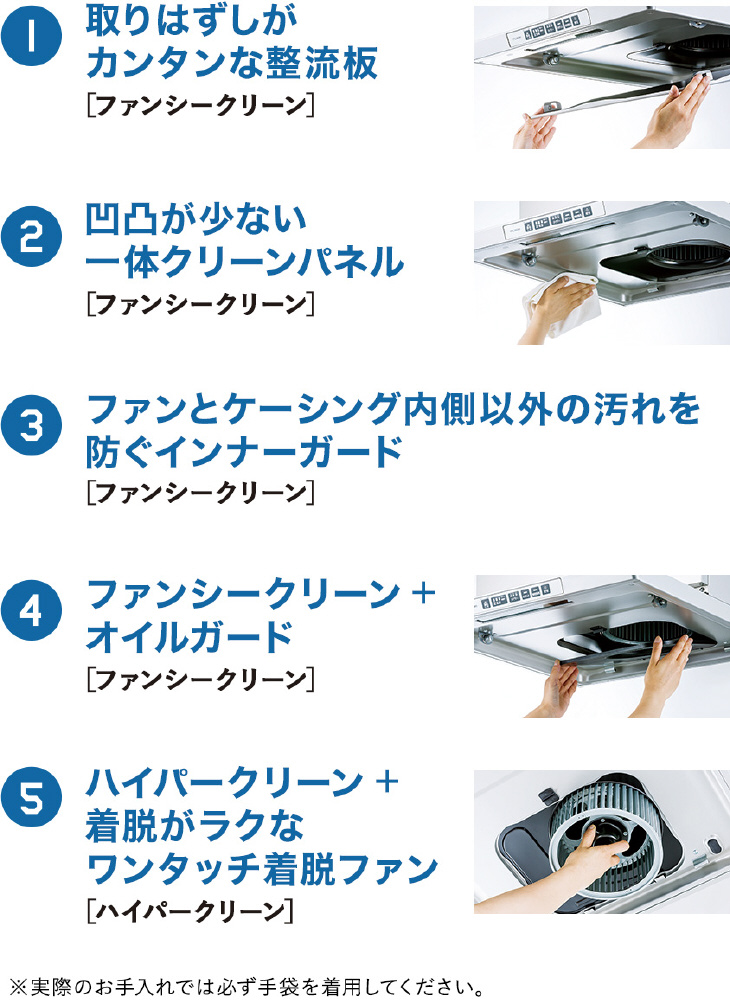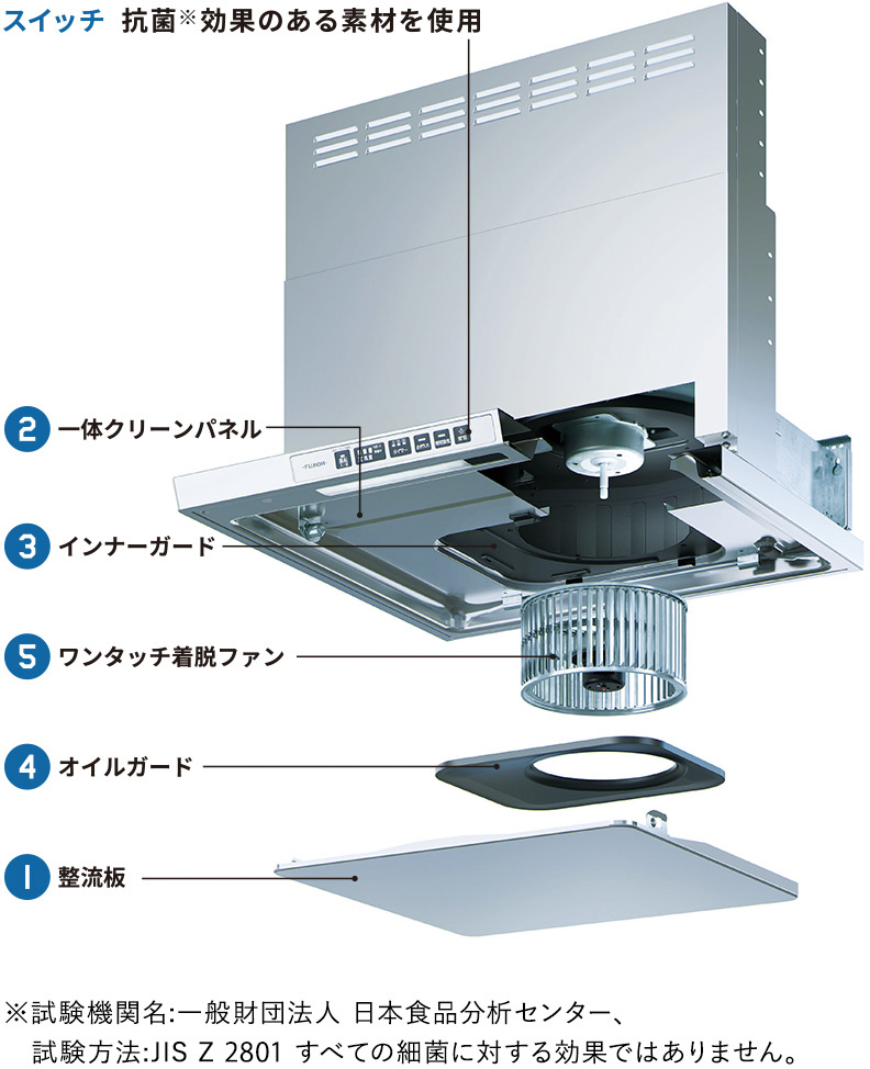 た場合、レンジフー ドを停止する機能も搭載しています。ただし、調理内容によっては調理終了からレンジフー ドが停止するまでに1時間ほどかかる場合があります。すぐに運転を停止したい場合はレンジフー ドを操作し、停止させてください。 ※4 ご使用の前にはあらかじめ取扱説明書で機能の特徴、操作方法を必ずご確認ください。 ※5 試験機関名:一般財団法人 日本食品分析センター、試験方法:JIS Z 2801 すべての細菌に対する効果ではありません。 ※6 常時換気は積算されません。 整流板、一体クリーンパネルは日常のお手入れでふいてください。