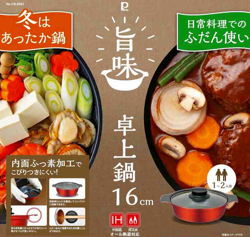 旨味 ふっ素加工IH対応ガラス蓋付 卓上鍋16cm HB-6962 [IH対応]