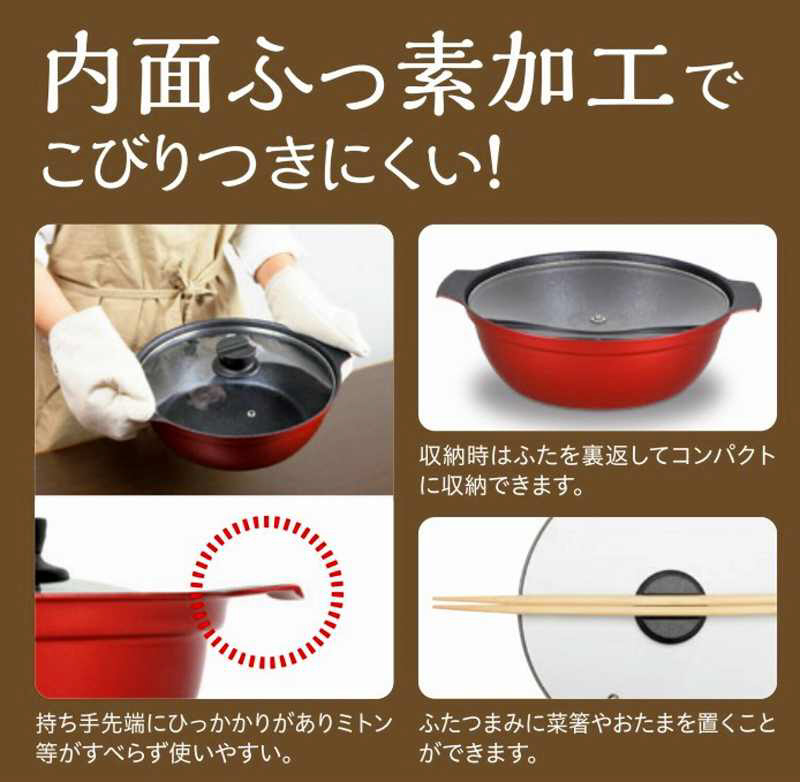 冬はあったか鍋!日常料理に使いやすい旨味シリーズミトンなどの掴みやすさにこだわった持ち手形状。持ち手先端にひっかかりがあり、ミトンなどがすべらずお使いいただけます。収納時はふたを裏返してコンパクトに収納!ふたつまみに菜箸やおたまが置けるので、取り分けなどにも便利です。内面にはふっ素樹脂加工を施しているので、お手入れも簡単。ご注意: オーブン、電子レンジには使用しないでください。