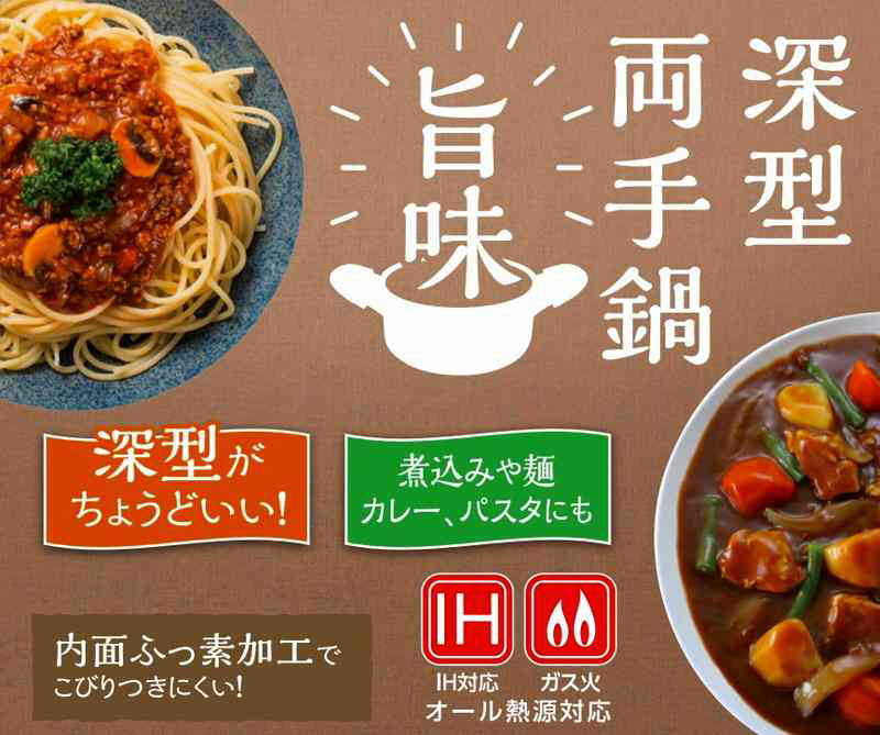 冬はあったか鍋!日常料理に使いやすい旨味シリーズ深型タイプなのでパスタや、カレー・シチューなどの煮込み料理にピッタリです。コンパクトサイズなので一人暮らしのキッチンでも場所を取りません。サイズに対して深さがしっかりあるので、ふだんの料理から煮込みまでこれ一つで万能に使えます。収納時はふたを裏返してコンパクトに収納!内面にはふっ素樹脂加工を施しているので、お手入れも簡単。