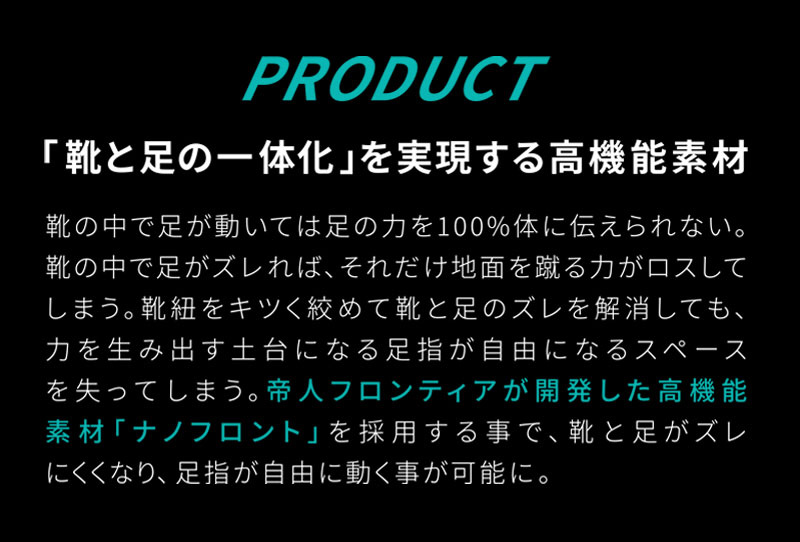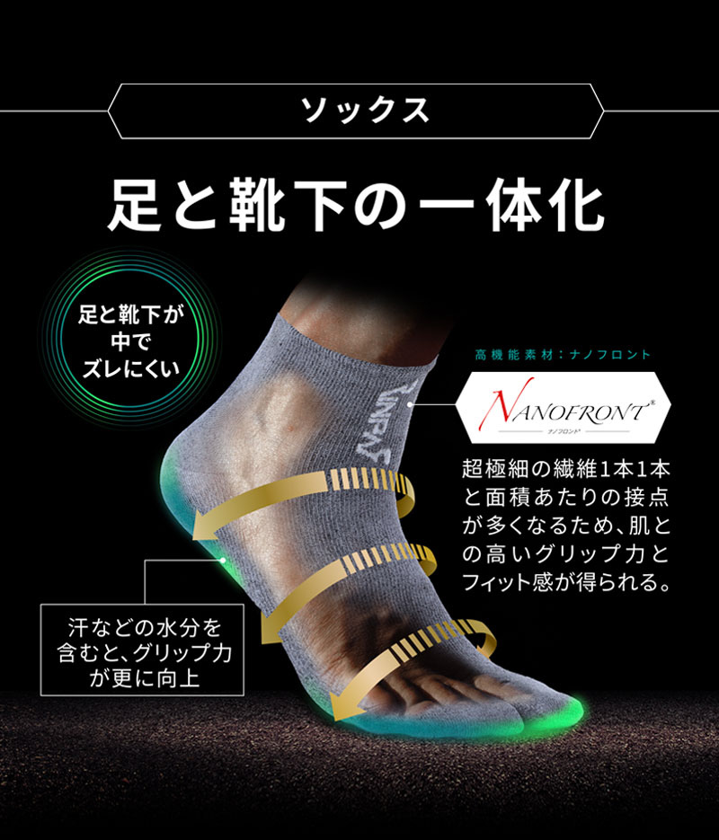 高機能素材「ナノフロント」によりインソールと靴下がしっかりくっつき密着することでズレにくくまるで足に吸着しているような使用感です。