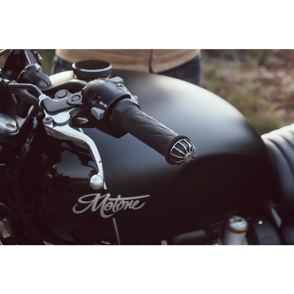 ハンドル周りのワンポイントに最適なリブデザインバーエンド「GEMINI(ジェミニ)」。耐久性と耐食性を両立したA6061アルミダイキャスト製。全体をパウダーブラック(粉体塗装)で仕上げた後に上面のみをポリッシュしたコントラストタイプ。