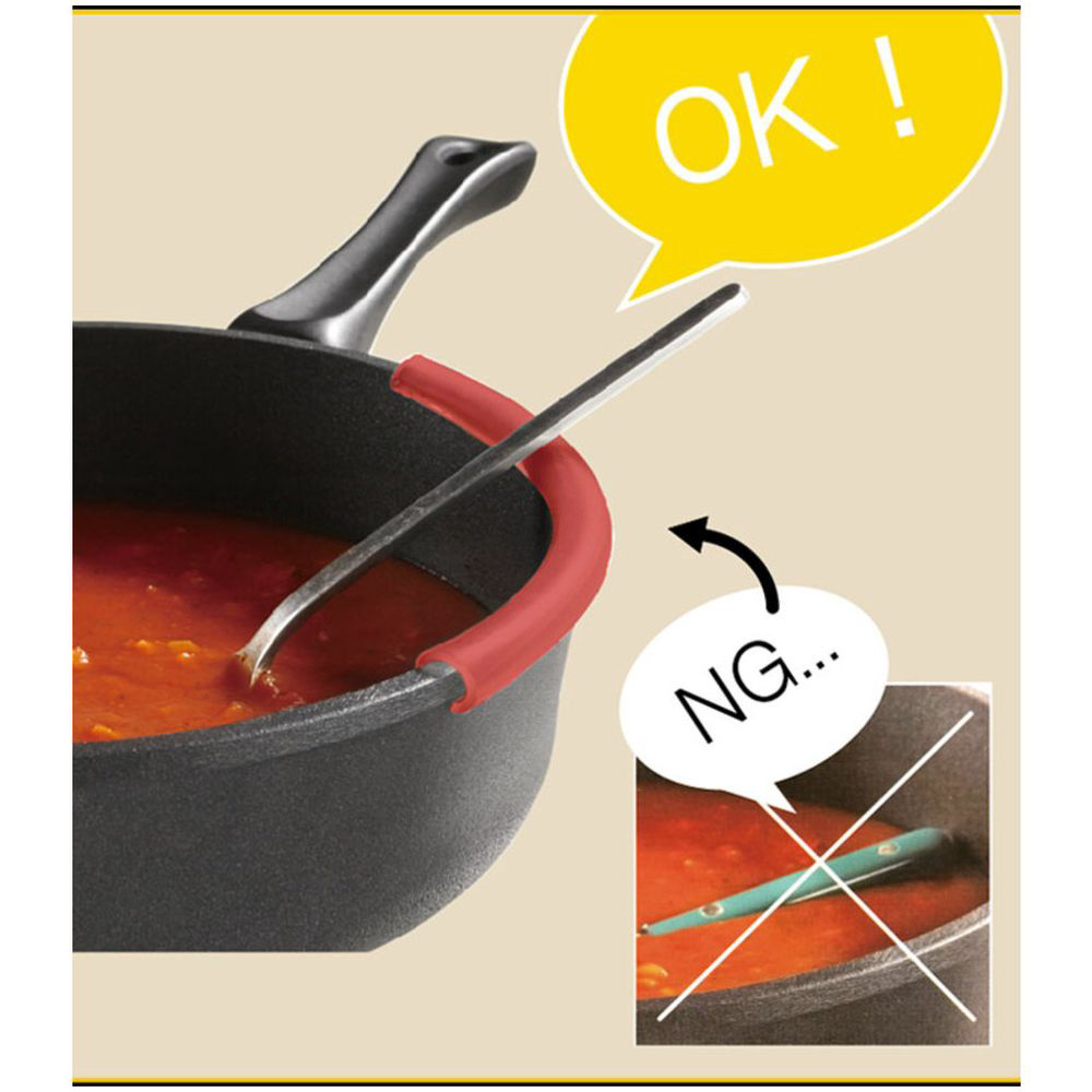 スプーンや菜箸、お玉などのキッチンツールが滑り落ちにくくなります。お料理の仕上げでソースをサーブする時にスプーンをちょい置きしたい、という時に大変便利です。柔らかいシリコーン製で着脱が簡単にでき、鍋やフライパンが傷付きません。お使いの鍋やフライパンのサイズに合わせて自由な長さにカットできます。食器洗浄機でご使用頂けます。