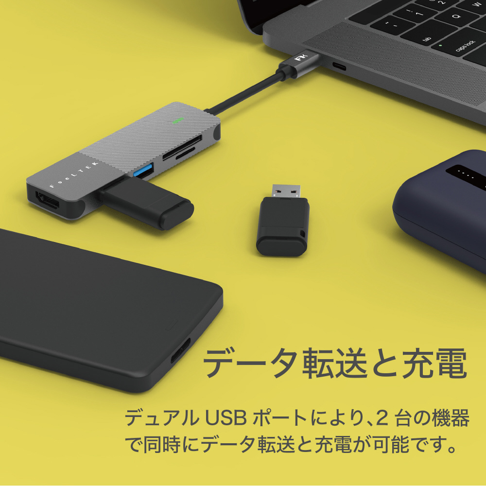デュアルUSBポートにより、2台の機器で同時にデータ転送と充電が可能です。
