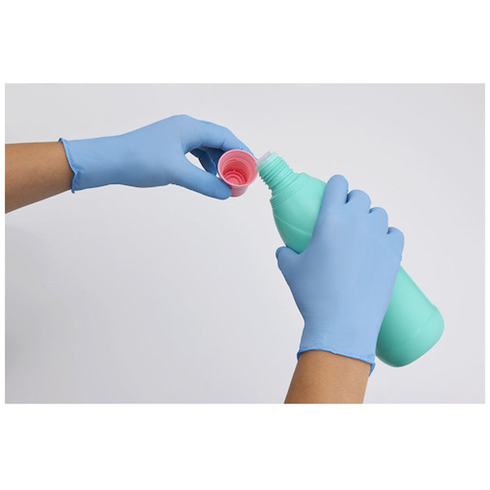 ■厚み約0.06mm、衛生的な粉なし(パウダーフリー)タイプの使い捨てニトリルゴム手袋(ニトリル手袋)。