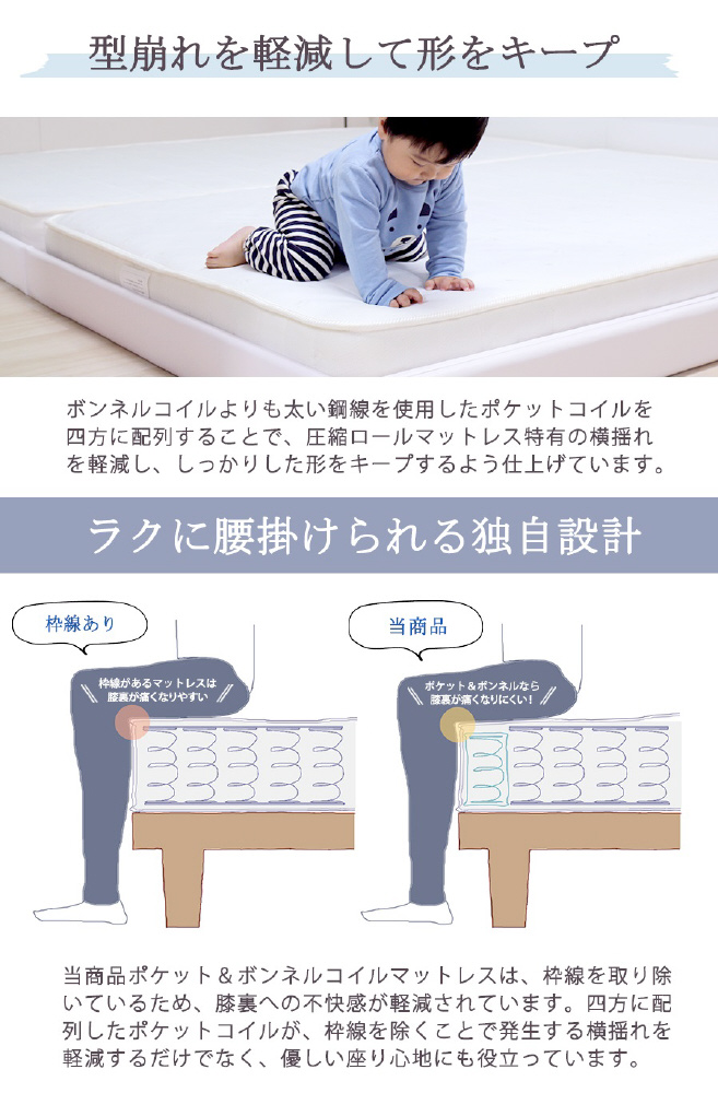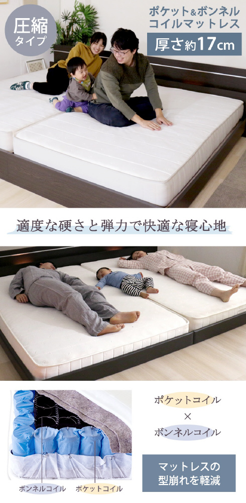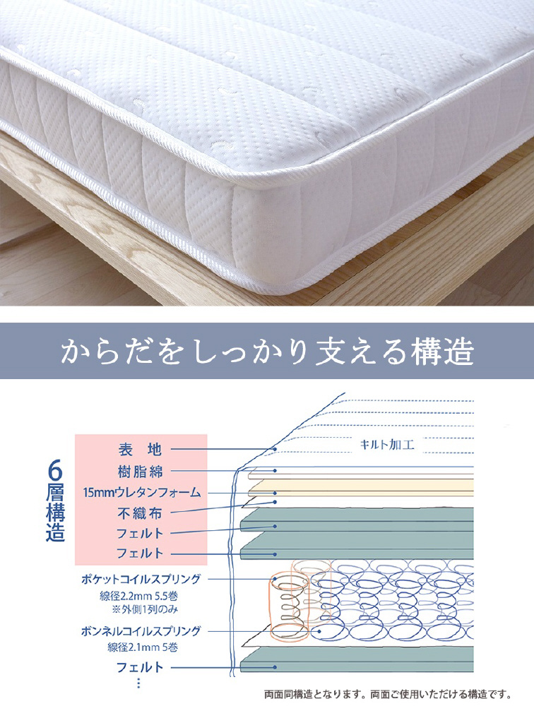 フレーム: プリント化粧板、床板: ハードボード、引出し中箱: 中質繊維版 マットレス: 2.1mmボンネルコイルスプリング(コイル数/D: 390)、2.2mmポケットコイルスプリング(コイル数/D: 104)、ウレタン、フェルト、ポリエステル