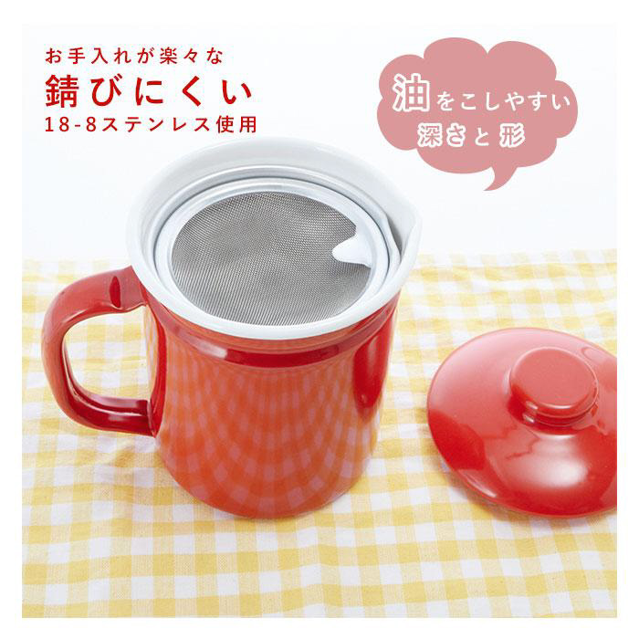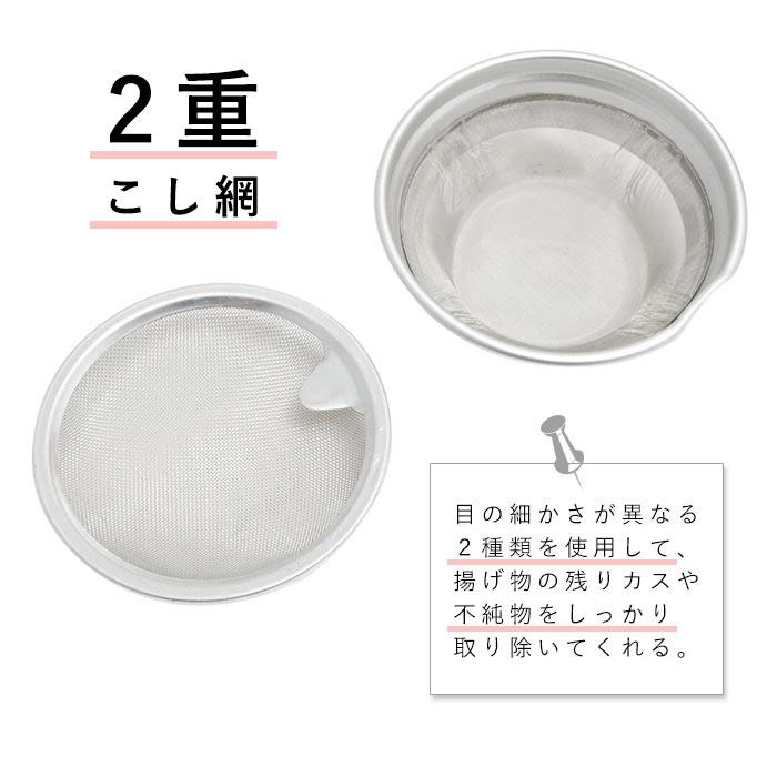 上下2重の網でしっかり油をこしてくれる。ホーロー加工なのでさびにくく、お手入れしやすい。シンプルで扱いやすいデザイン。