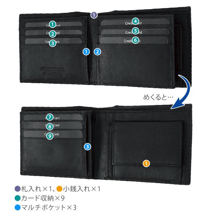 ■内側は、札入れ×1、小銭入れ×1、カード収納×9、マルチポケット×3。