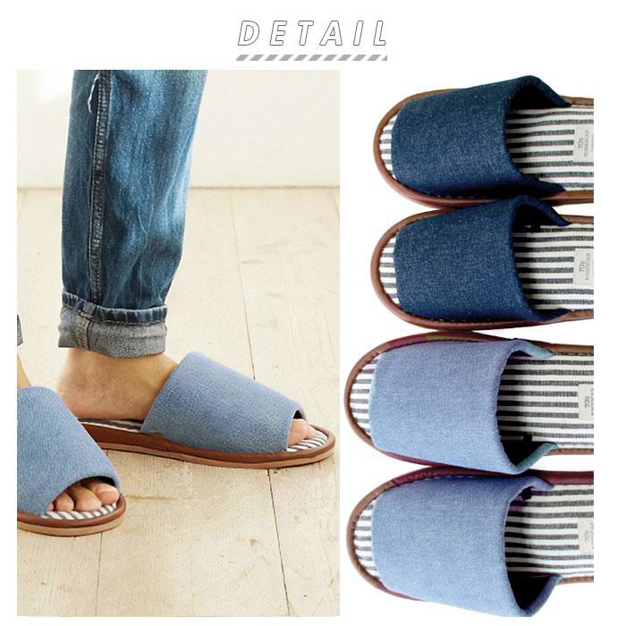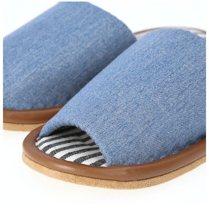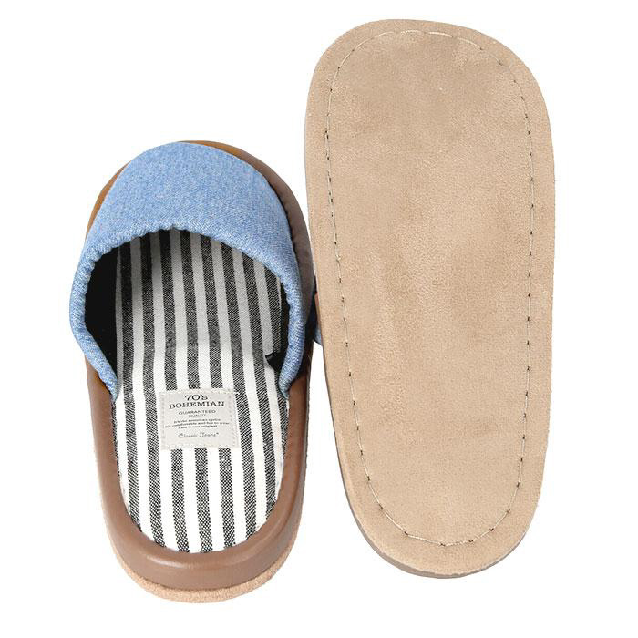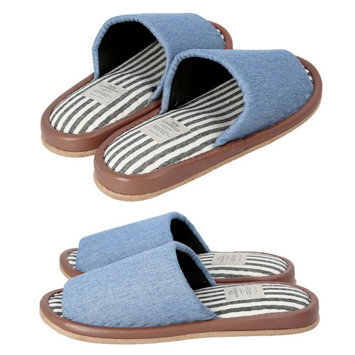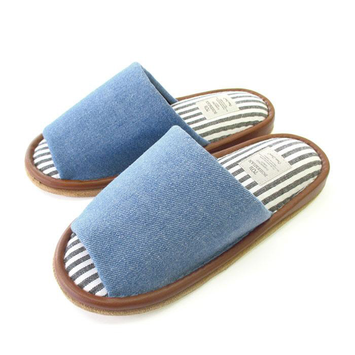 デニム生地と中敷の爽やかなストライプが相性抜群なスリッパが登場。