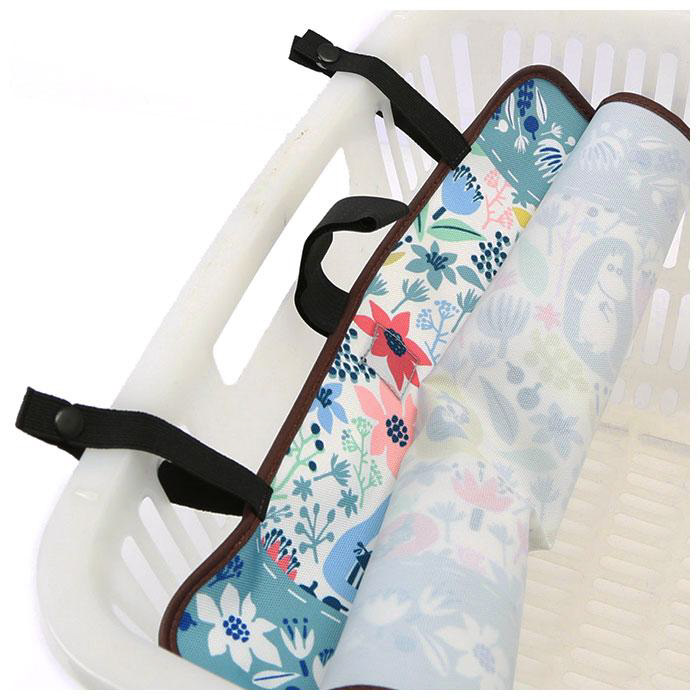 ■ボタン付きのゴムをかごの片側に固定し、留めてある面ファスナーを外してカバーを被せる簡単仕様。
