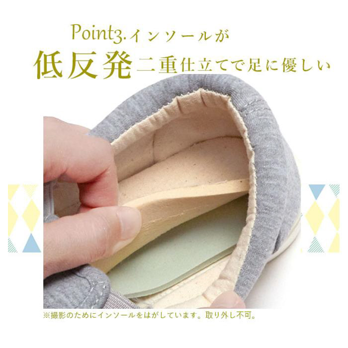 ■靴紐がなく、さっと足を入れることができるので、脱ぎ履きが楽ちんです。