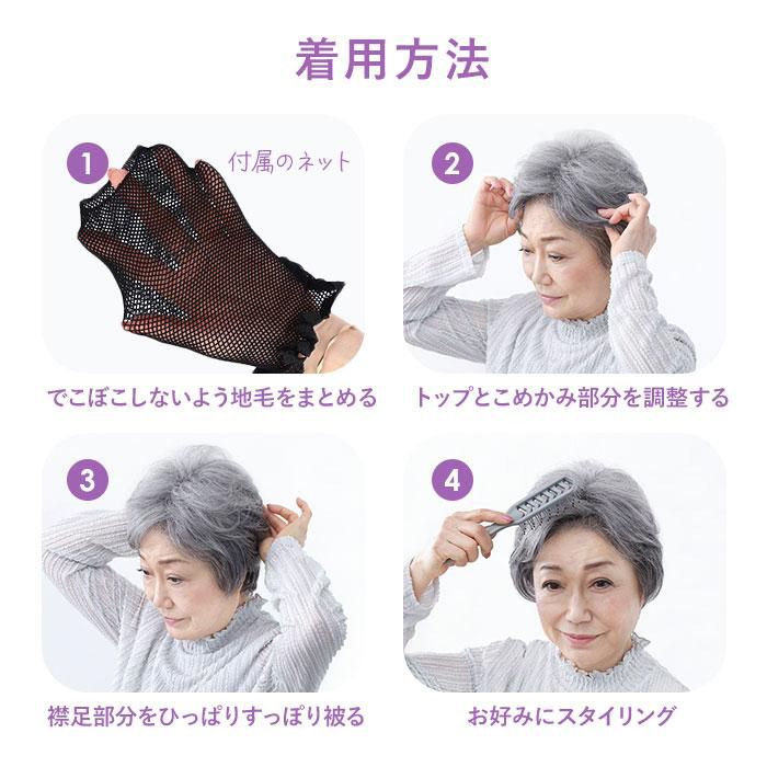 ■ネットで自毛をまとめたらウィッグを帽子のようにすっぽりと被り、位置を調節しながらスタイリングするだけ!