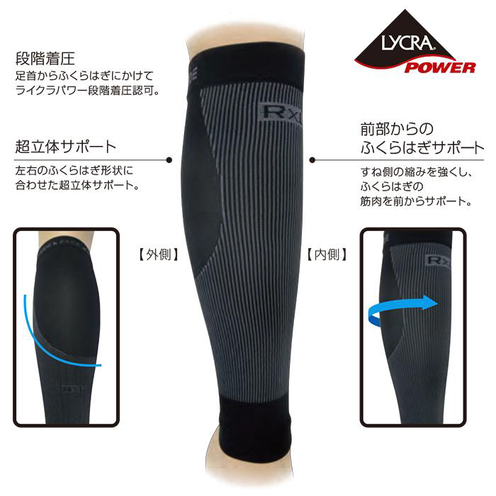 ■持続能力も高く、脛側の特殊な編み構造で、脛側に引きつけ、包み込むようにサポート。
