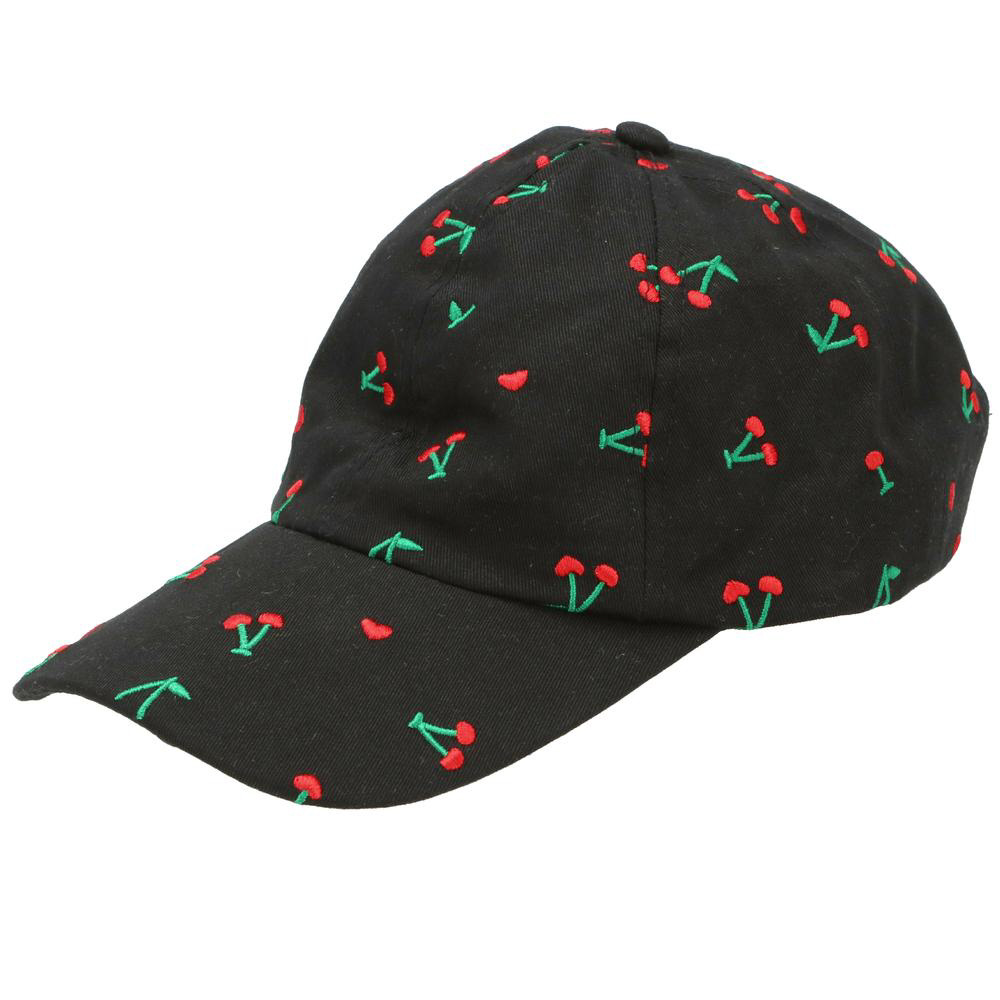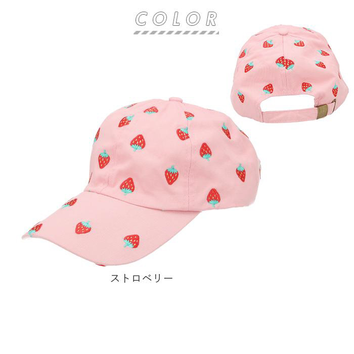 ■刺繍キャップは、生地全体に可愛らしいイチゴなどのフルーツ、ひなぎくのような花柄の刺繍をちりばめたキュートなカラーバリエーション!