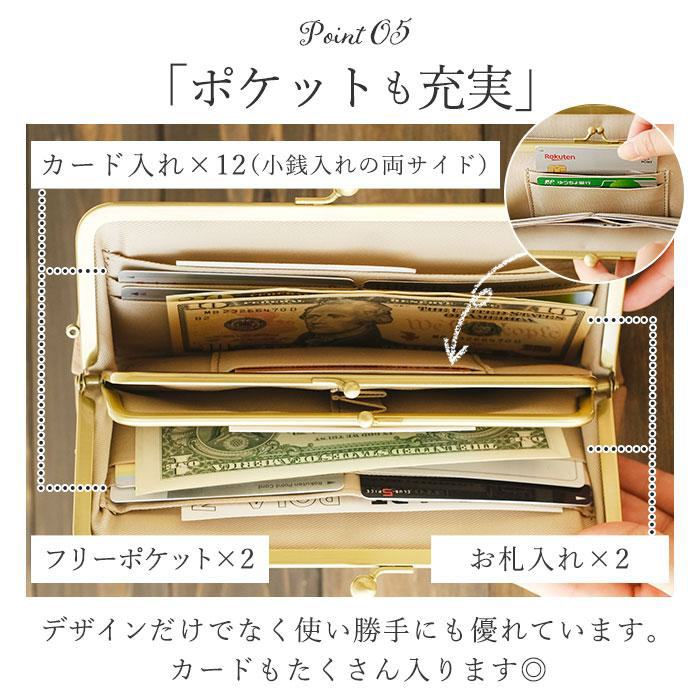 ■前面のオシャレな型押しの花柄とブランドロゴが目を引く新しいデザインのガマ口財布に仕上げました。