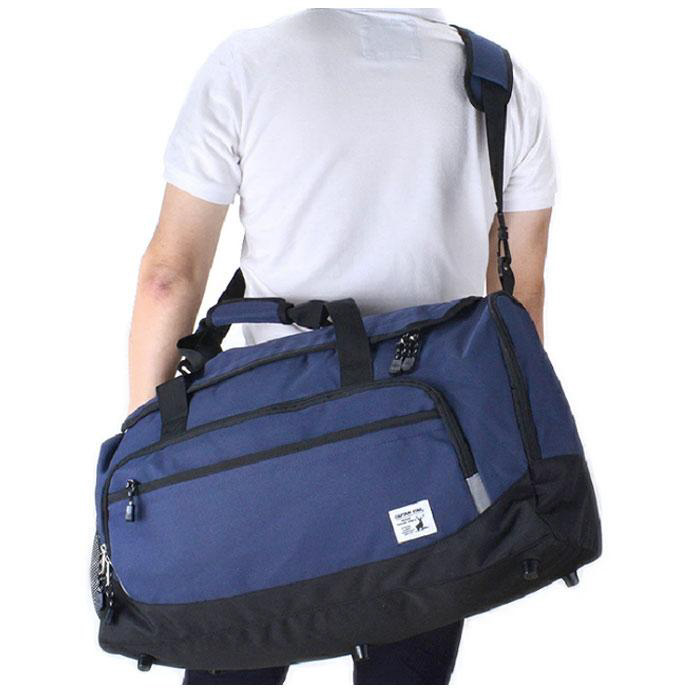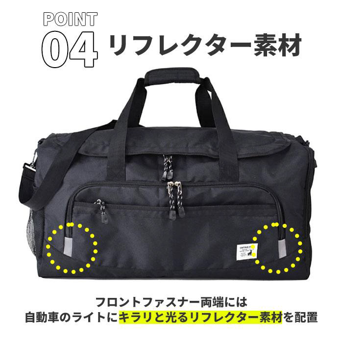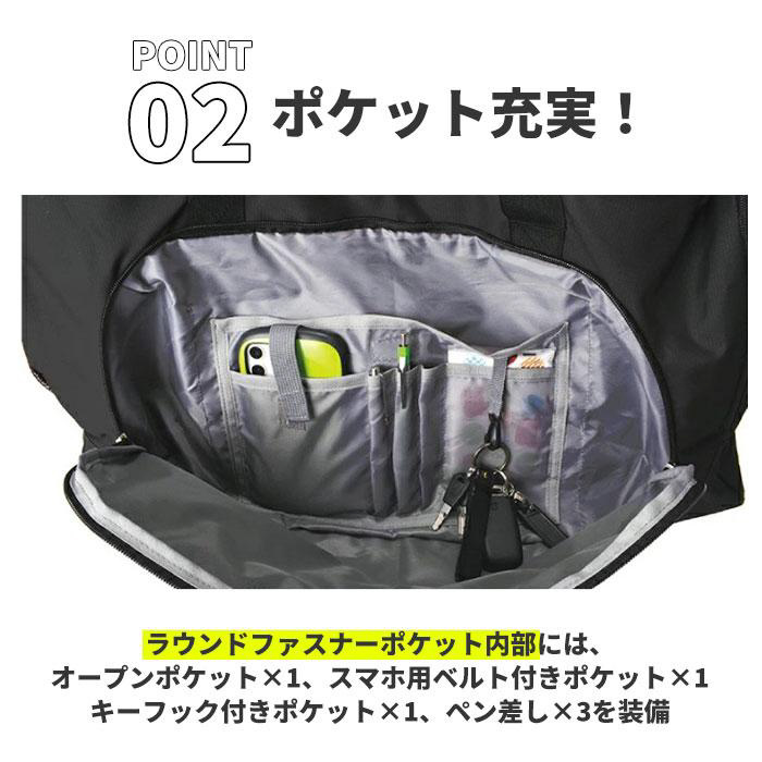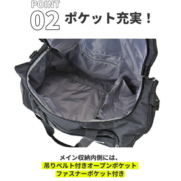 ■バッグ右サイドにはシューズ専用ポケット、左サイドにはウォーターボトルやタオル用のメッシュポケットも設け、フィットネスジムやスポーツ合宿用のバッグとしても最適。