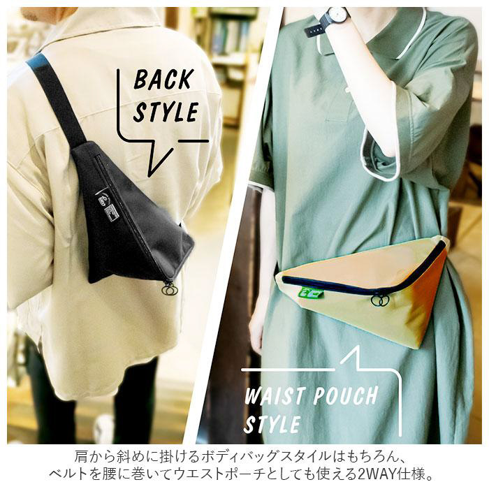 ■肩から斜めに掛けるボディバッグスタイルはもちろん、ベルトを腰に巻いてウエストポーチとしても使える2WAY仕様。