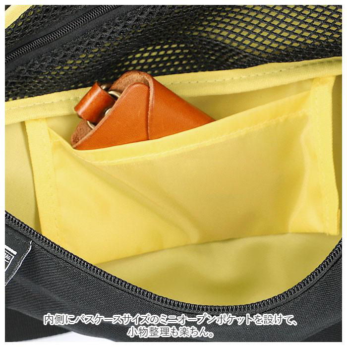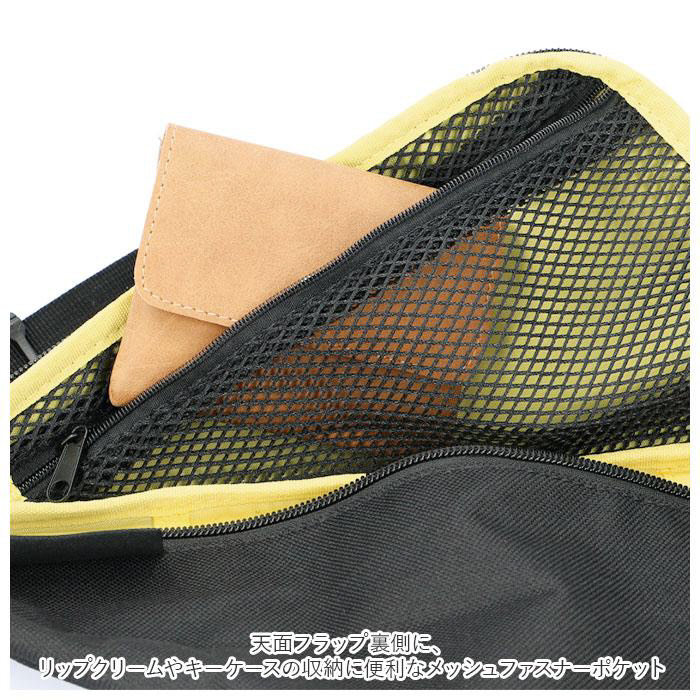 ■天面フラップ裏側に、リップクリームやキーケースの収納に便利なメッシュファスナーポケット、内側にパスケースサイズのミニオープンポケットを設けて、小物整理も楽ちん。