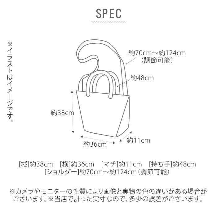 ・サイズ: [縦] 約38cm [横] 約36cm [マチ] 約11cm [持ち手] 約48cm [ショルダー] 約70cm-約124cm(調節可能)