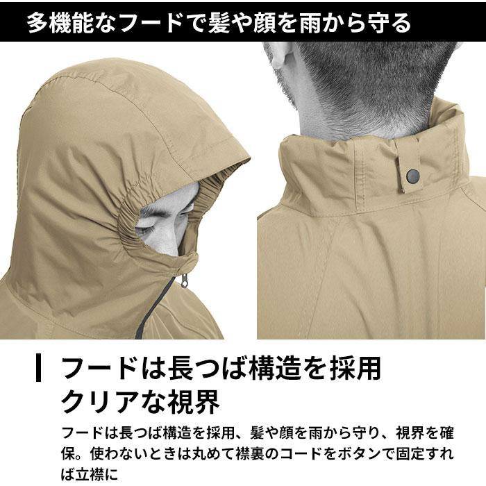 ■フードは長つば構造を採用、髪や顔を雨から守り、視界を確保。