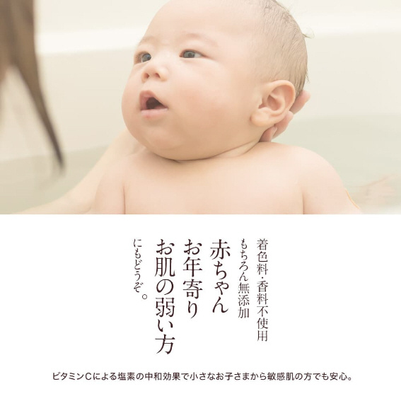 発泡時、ビタミン C が瞬間的に残留塩素を中和しますので、湯あたりがとても柔らかくなります。