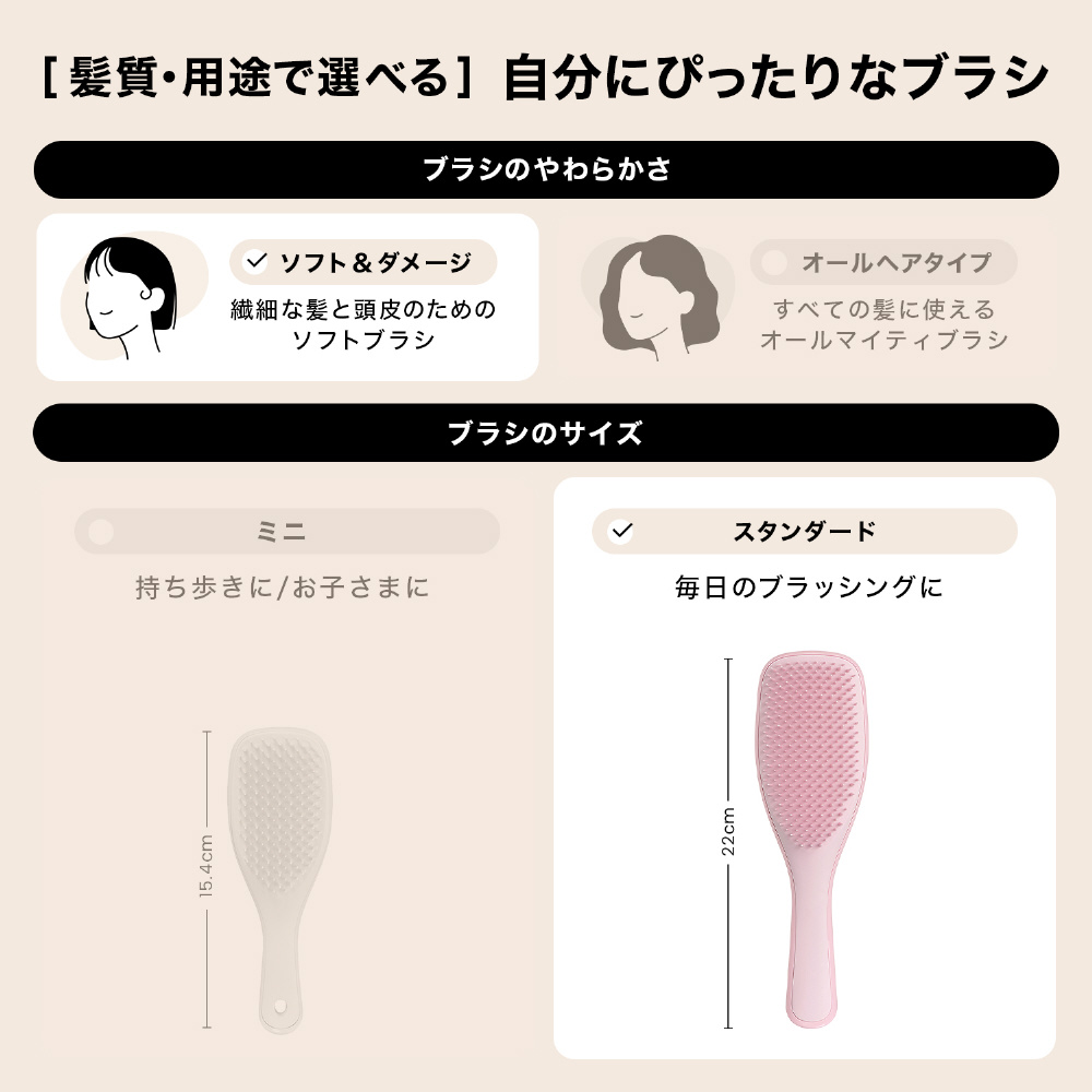 ブラシ部分がやわらかく、やさしい力加減で、髪の絡まりを少しずつ解きほぐすことが可能。