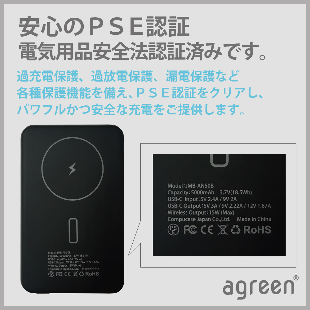 アルミ製超薄型マグセーフ5000mAhモバイルバッテリー(PD20W) 付属ケーブル:A to Type-C agreen シルバー JMB-AN50B-SV