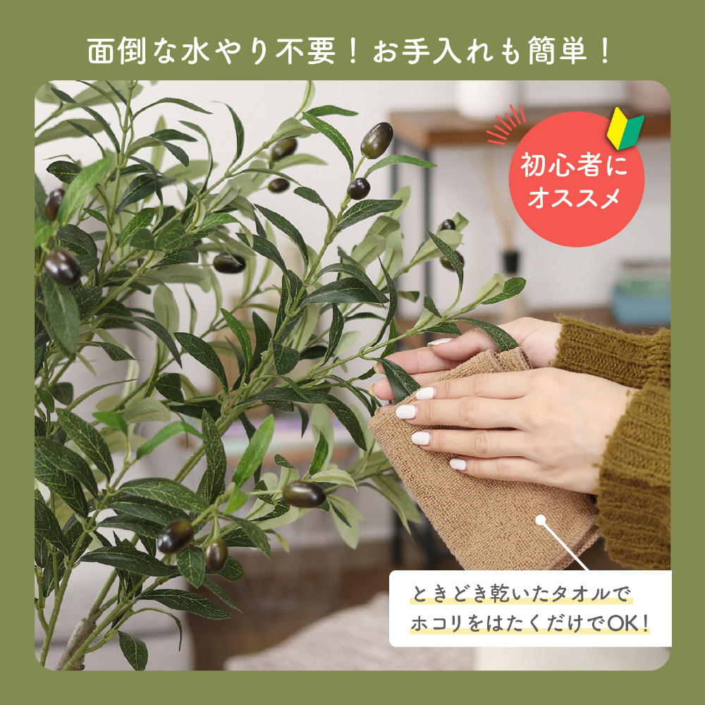 フェイクグリーンなので水やりなどの手入れを気にすることなく楽しめます。ときどき乾いたタオルでホコリをはたくだけでOK!