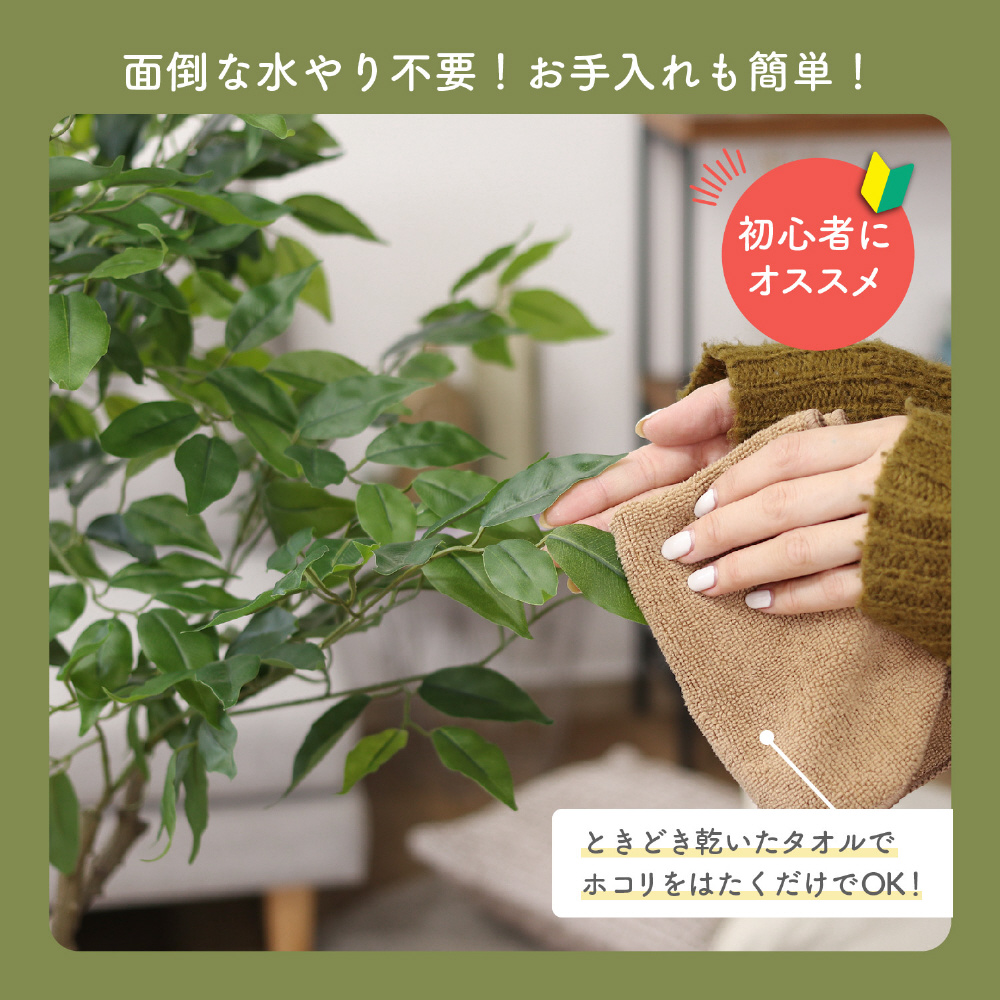 フェイクグリーンなので水やりなどの手入れを気にすることなく楽しめます。ときどき乾いたタオルでホコリをはたくだけでOK!