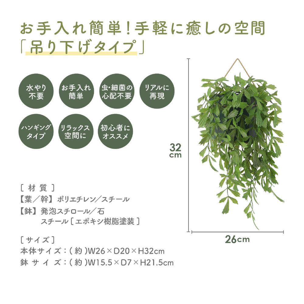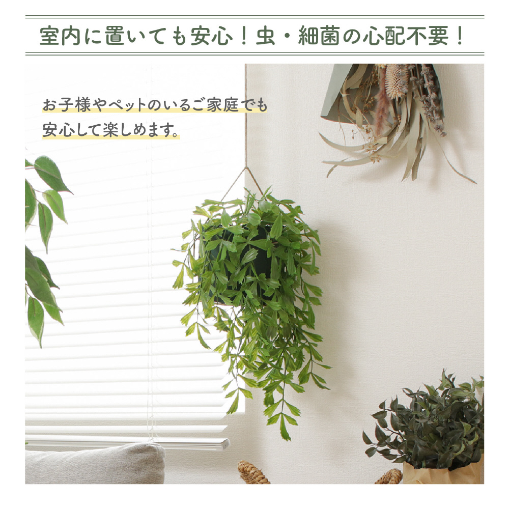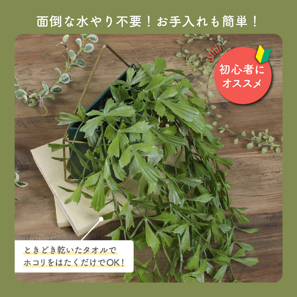 フェイクグリーンなので水やりなどの手入れを気にすることなく楽しめます。ときどき乾いたタオルでホコリをはたくだけでOK!