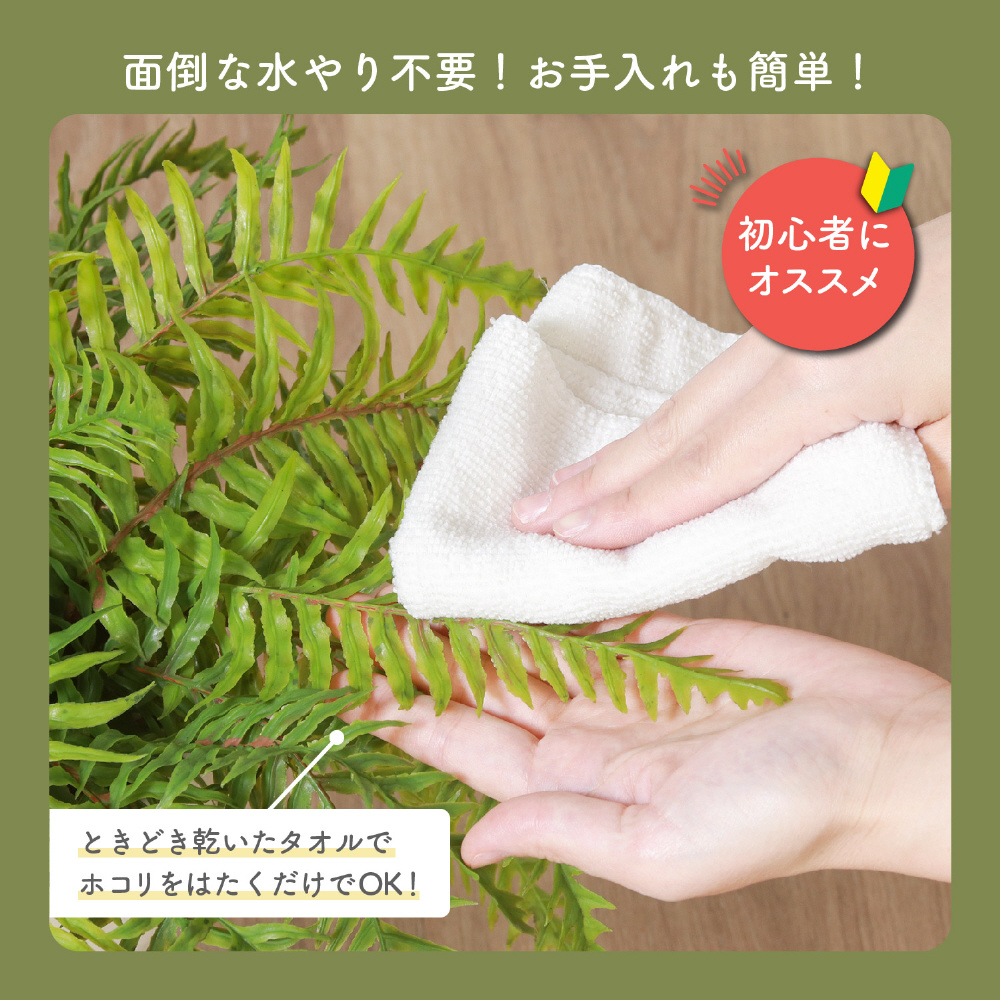 フェイクグリーンなので水やりなどの手入れを気にすることなく楽しめます。ときどき乾いたタオルでホコリをはたくだけでOK!