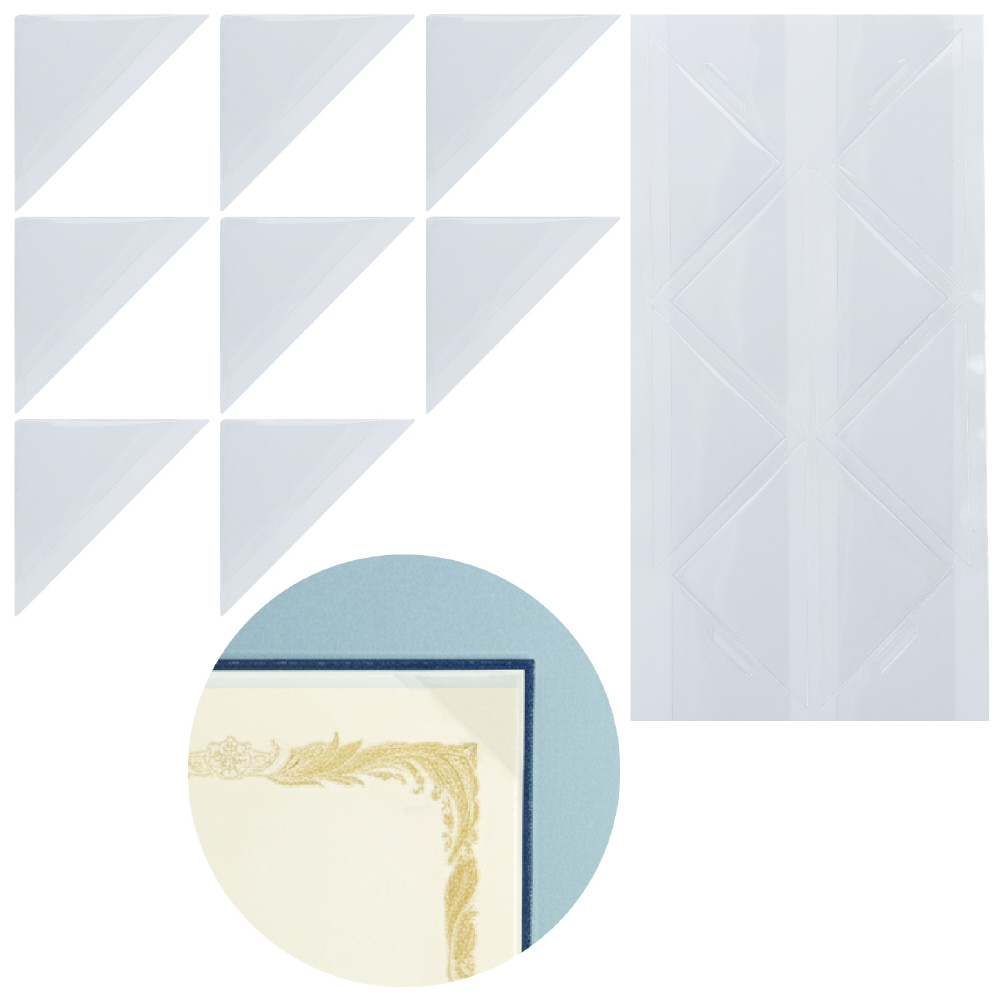 証書や写真などポケットに差し込んで固定できる、コーナーポケットシールです。丈夫なビニール製です。シールを好きな位置に貼れば、小さいサイズの証書や写真なども固定できます。そのほか、ファイルや手帳などに貼って、書類を保管することもできます。ポケットに差し込むので、穴を開けたりせずに綺麗に固定できます。