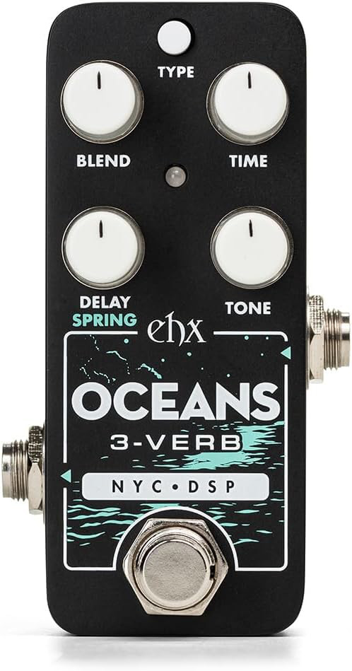 EHX Pico Oceans 3-Verbは、アンビエンスに必要な要素を詰め込んだ、柔軟性とコントロール性に富んだウルトラコンパクトサイズのリバーブ・ペダルです。最小限のスペースでスプリング、プレート、ホールの3タイプのリバーブの巨大なサウンドをペダルボードに加えることができます。ディケイ・タイム、プリディレイ/スプリングの長さ、トーンを調整可能で、広がりのあるサウンドを数多く作り出すことができます。